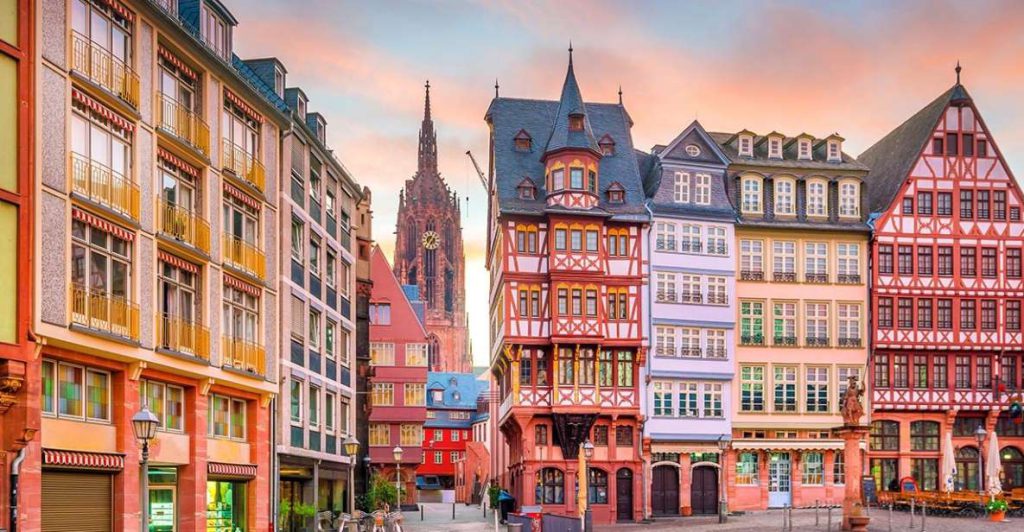 Frankfurt’s Old Town/Altstadt has cobbled streets and is lined with half-timbered & gabled buildings and shops that sell traditional souvenirs – ceramics, dolls, and dirndl dresses – as well as local food specialties such as sausages and apple wine.